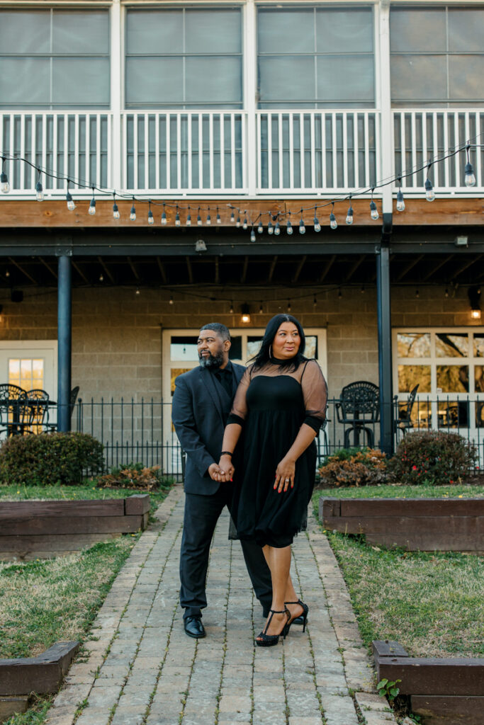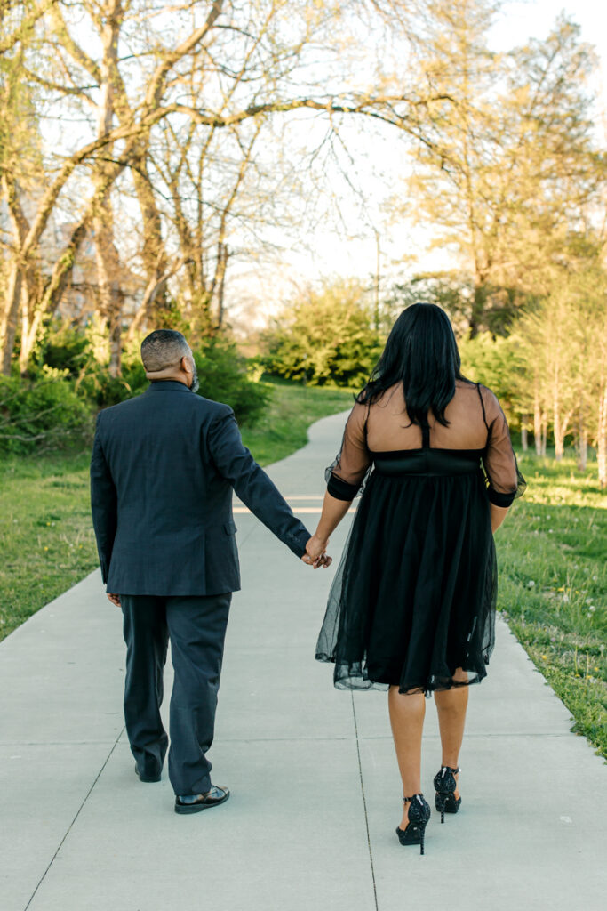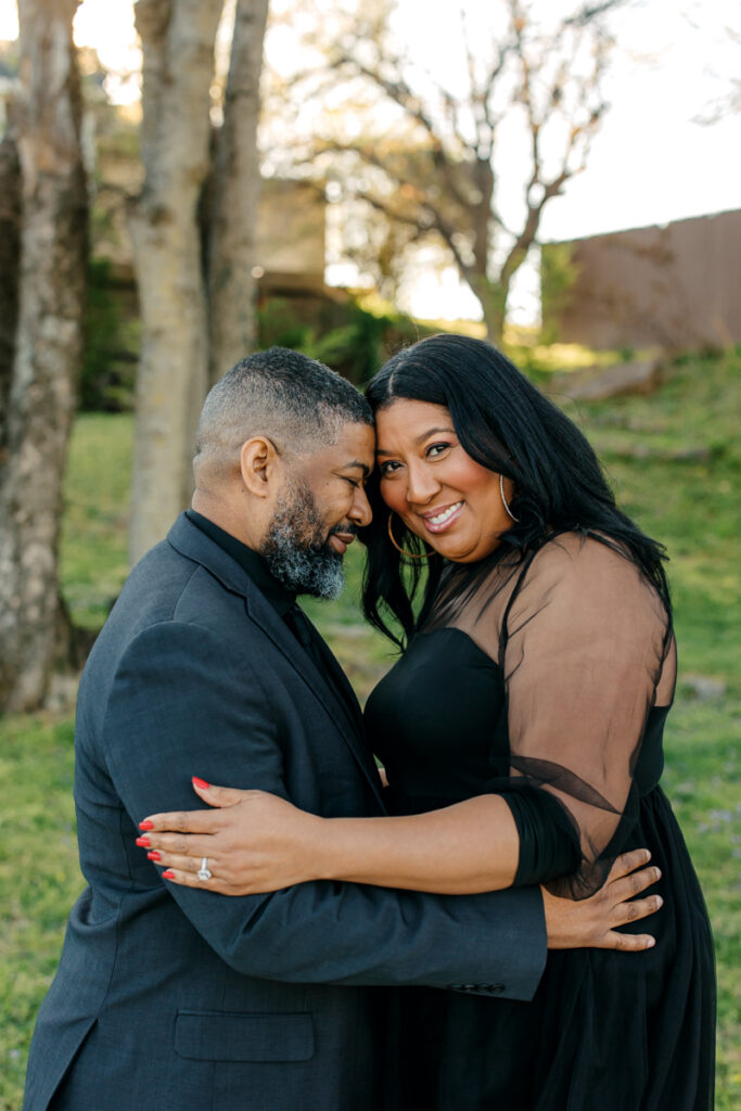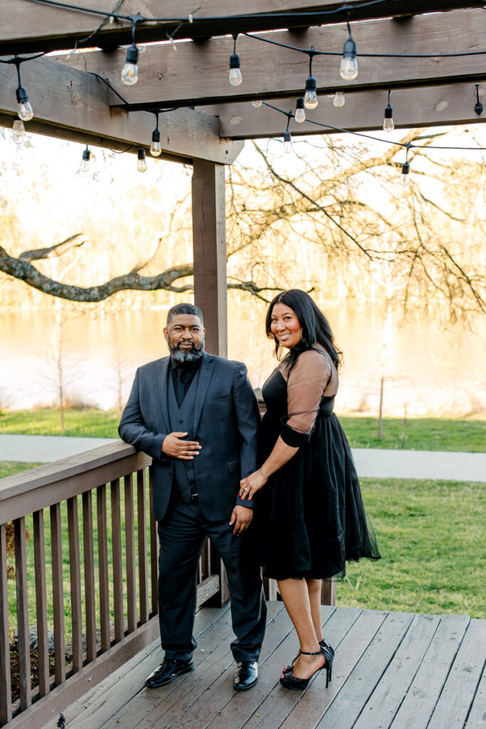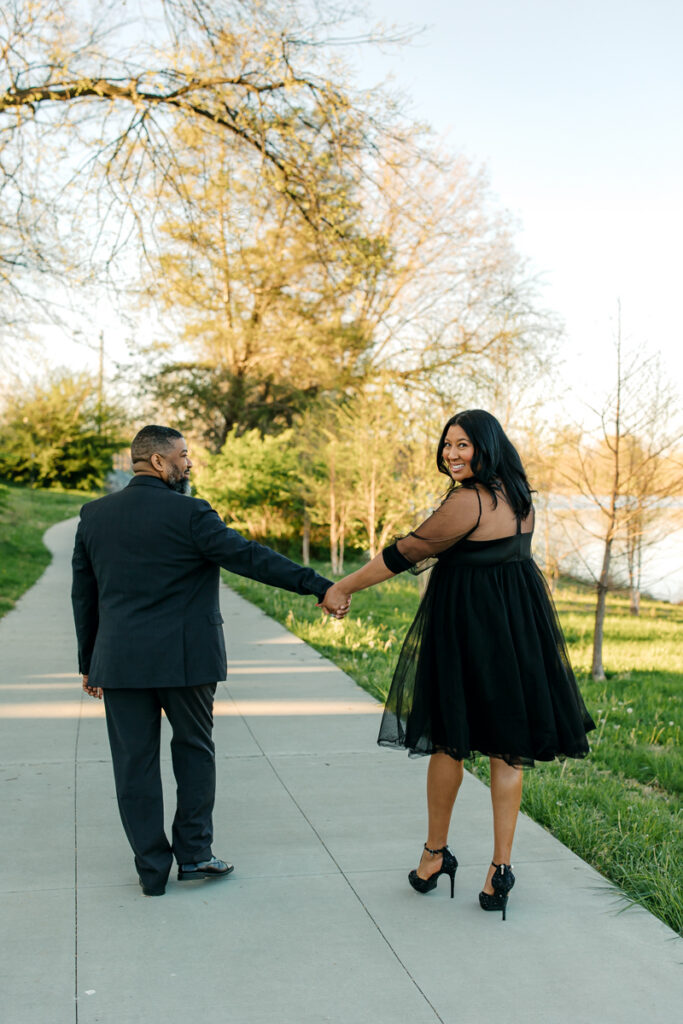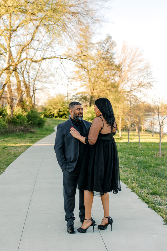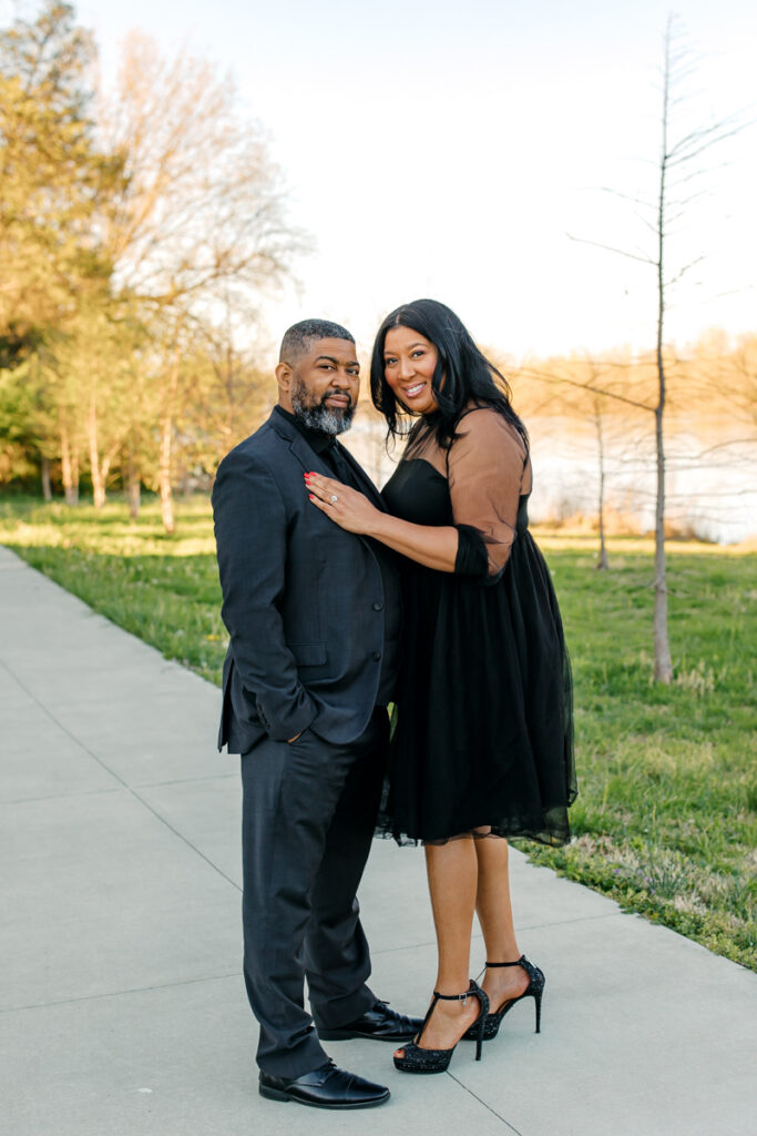 For their Hendersonville, TN engagement session, they chose their wedding venue, Lighthouse on the Lake. The venue sits along a serene lake with a quaint walking trail, perfect for romantic strolls. I always suggest dressing formally for engagement photos. Gisele and Columbus nailed it with their all-black ensembles, which popped beautifully against the lush greenery of the backdrop.