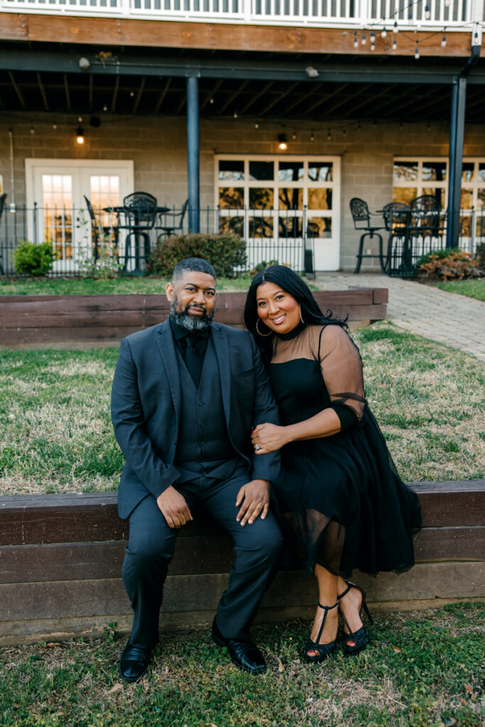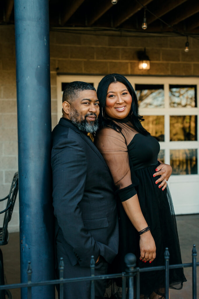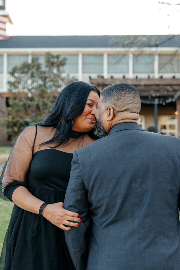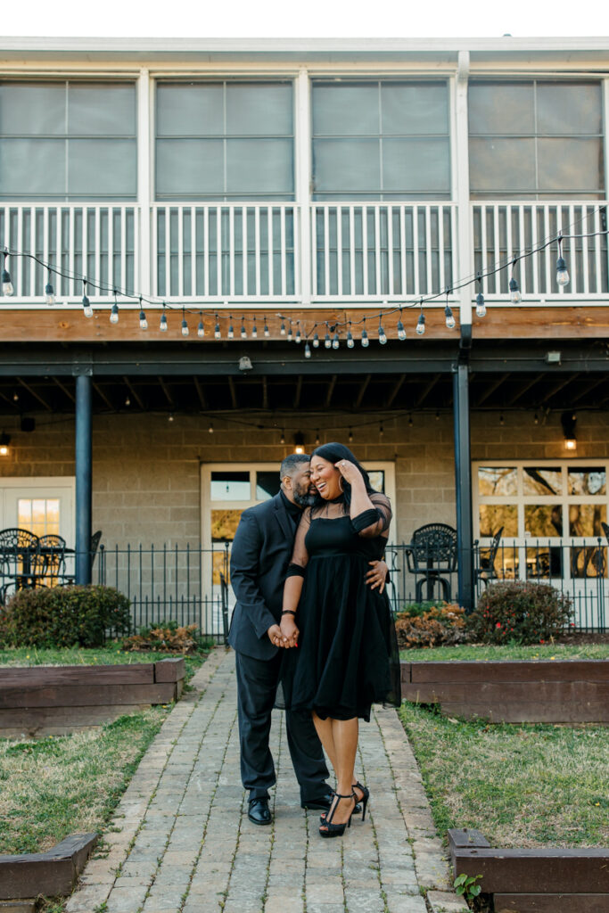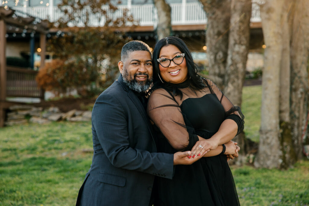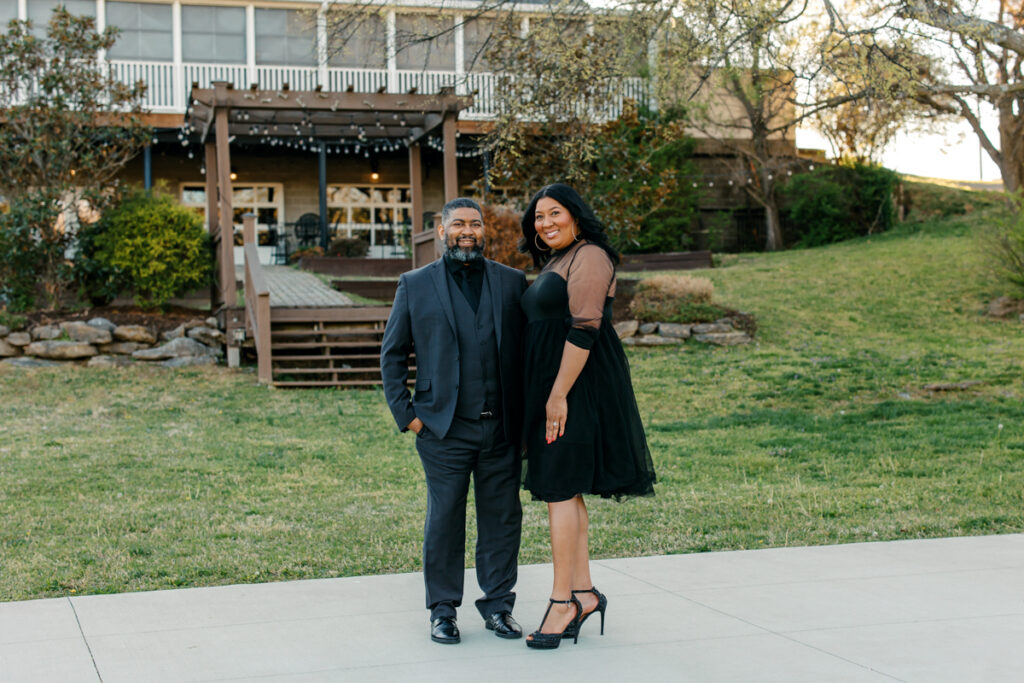For their Hendersonville, TN engagement session, they chose their wedding venue, Lighthouse on the Lake. The venue sits along a serene lake with a quaint walking trail, perfect for romantic strolls. I always suggest dressing formally for engagement photos. Gisele and Columbus nailed it with their all-black ensembles, which popped beautifully against the lush greenery of the backdrop.