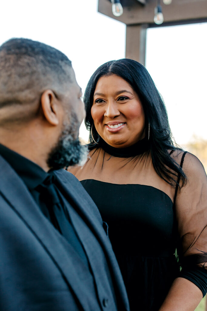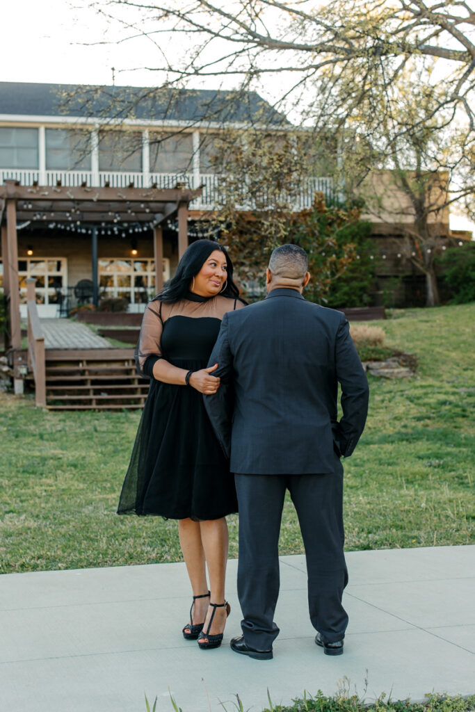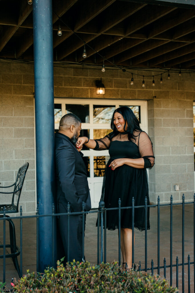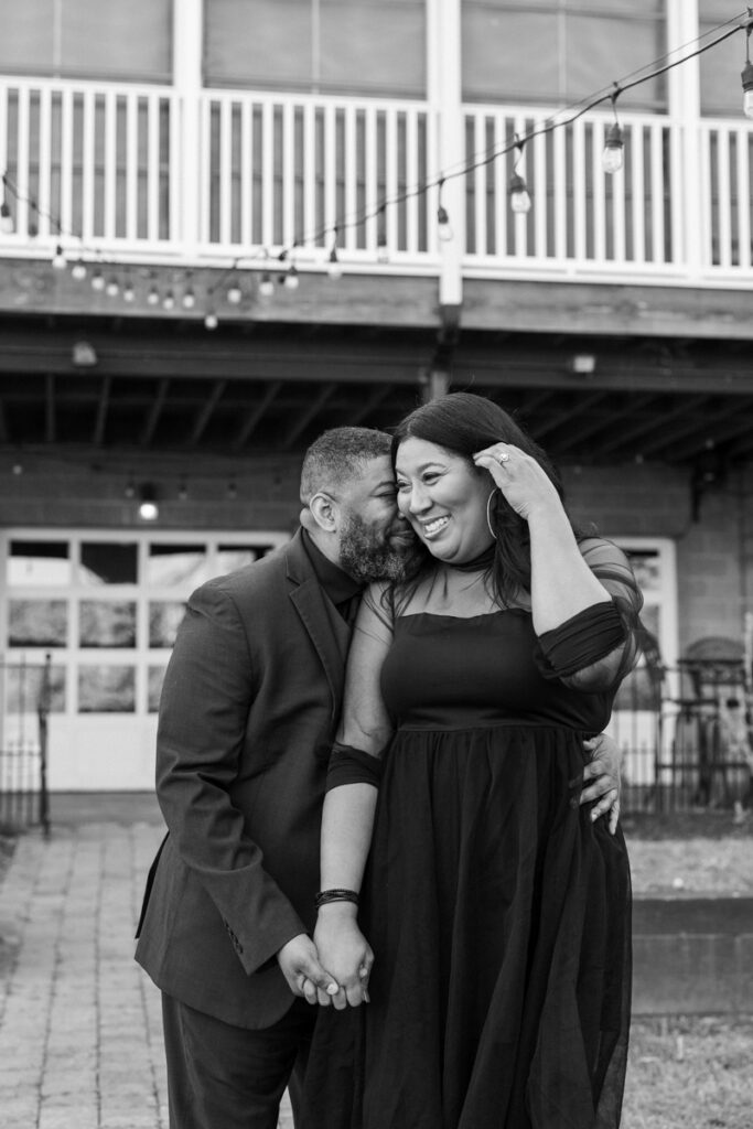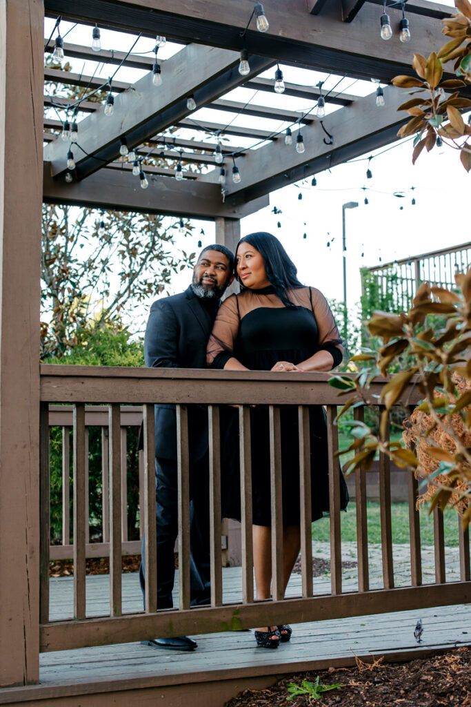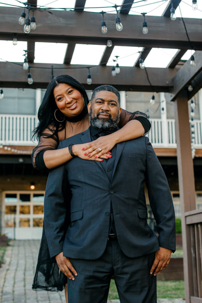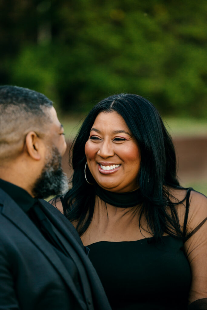 For their Hendersonville, TN engagement session, they chose their wedding venue, Lighthouse on the Lake. The venue sits along a serene lake with a quaint walking trail, perfect for romantic strolls. I always suggest dressing formally for engagement photos. Gisele and Columbus nailed it with their all-black ensembles, which popped beautifully against the lush greenery of the backdrop.